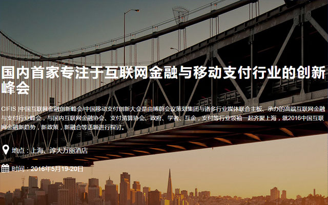 第四届中国互联网金融创新峰会-中国移动支付创新大会、由博蔚会议策划集团主办,新华网,腾讯网,第一财经、网贷之家、网贷中国等多家媒体联合支持,集结众多业内大佬与行业精英,本届峰会集结了30余位余位业内专家及行业精英共同围绕“引领未来·跨界融合”为中心主题,就2016年互联网金融行业的机遇与挑战“2016年中国互联网金融趋势判断”与“互联网金融新生态”进行专业研究与探讨。如何能够在互联网金融行业有法可依,有规可循的时期,找寻适合自己平台的发展成长途径,如何能够快速甄别出合规合法的互联网金融平台,都将是此次高峰论坛的关注重点。与会嘉宾将从云计算、移动支付、大数据、专业研究机构、P2P/众筹平台多角度多维度进行思想碰撞与专业探讨。